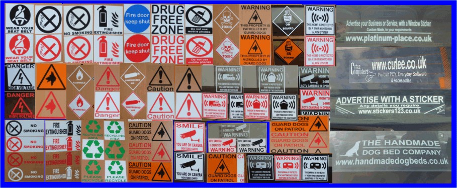 Car Stickers - Van Stickers - Signs - Novelty Stickers - Security Stickers - Fun Stickers - Window Stickers - Door Stickers - Internal Window Stickers - External Stickers - Bumper Stickers - Advertising Stickers - Business Stickers - Shop Window Stickers - Promotional Stickers - Marketing Stickers - Truck Stickers - Create your own Sticker - Slogans